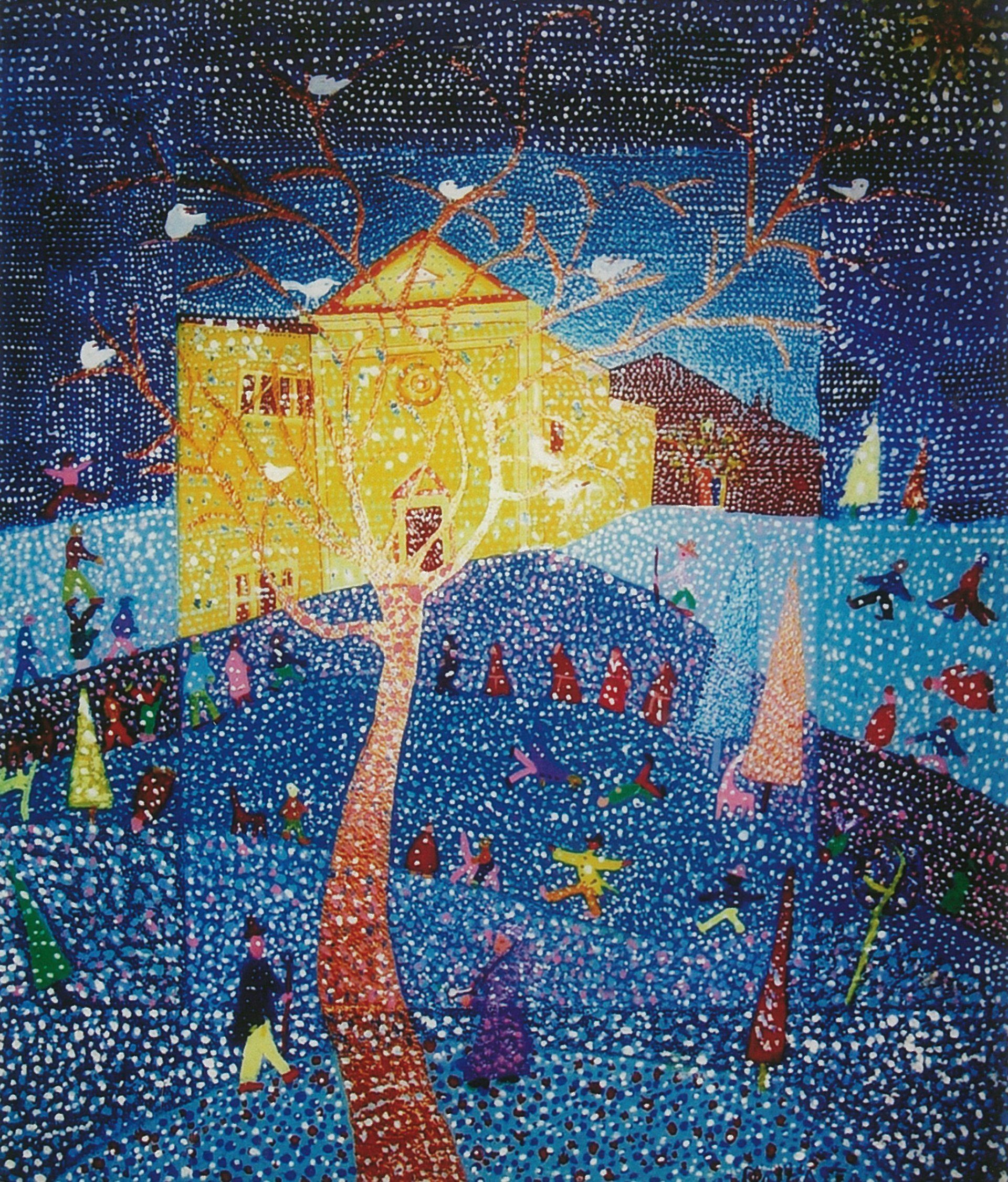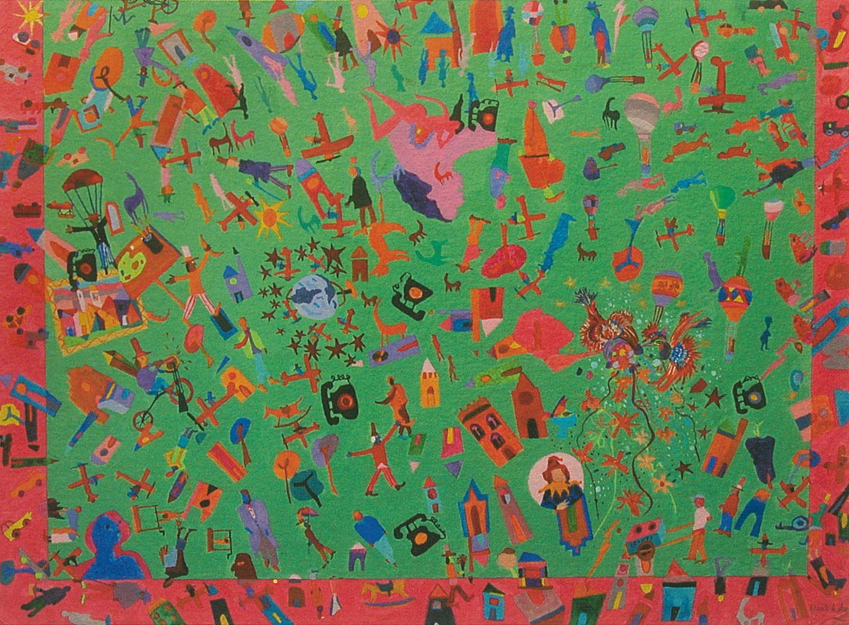 Teatrini populistici di trasognata cronaca, dove il copione talvolta si ripete producendo però una percezione sempre diversa, affidata a ingenue soluzioni formali, a piatte campiture coloristiche che ripercorrono paradisi infantili.